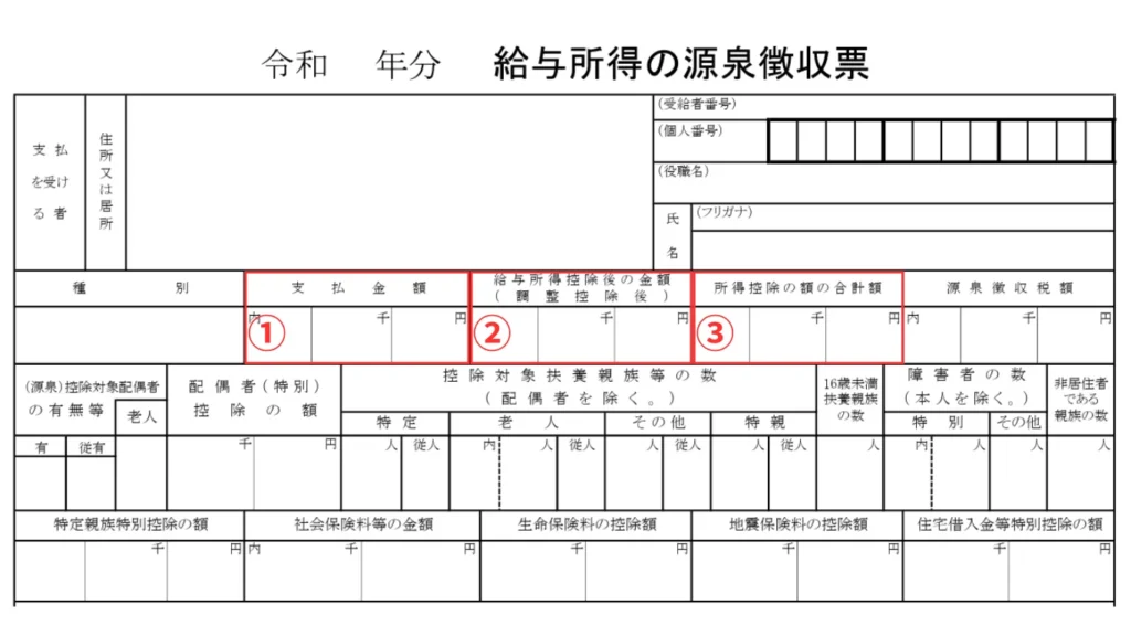 支払金額欄には、1年間の給与・賞与の合計額が記載されます。ここに載っているのは、税金などが差し引かれる前の額面金額です。