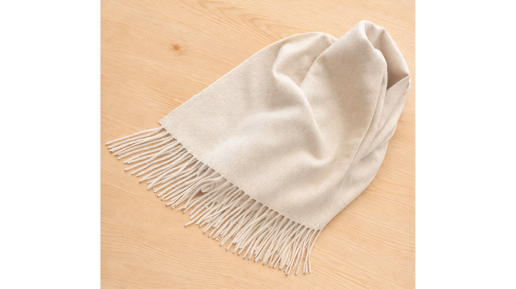 次に紹介するのは、Noble Fibreのカシミヤ・大判ストールです。カラーは、オーガニックホワイト。白に近い生成りのような色合いです。