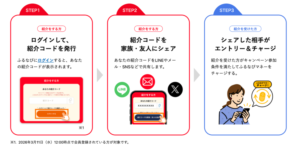 2026年3月11日(水)12:00より、「紹介するたび500円分!最大5,000円分のふるなびマネーがもらえる!ふるなびマネー紹介キャンペーン」がスタートしました。